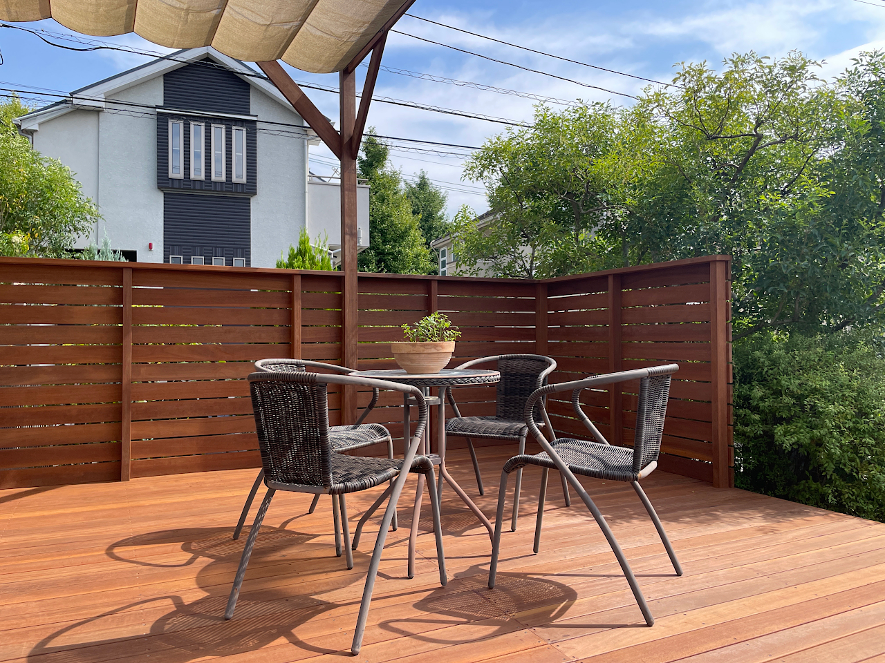 フェンスやパーゴラも同系色で統一し、落ち着いたプライベートテラスへ。
