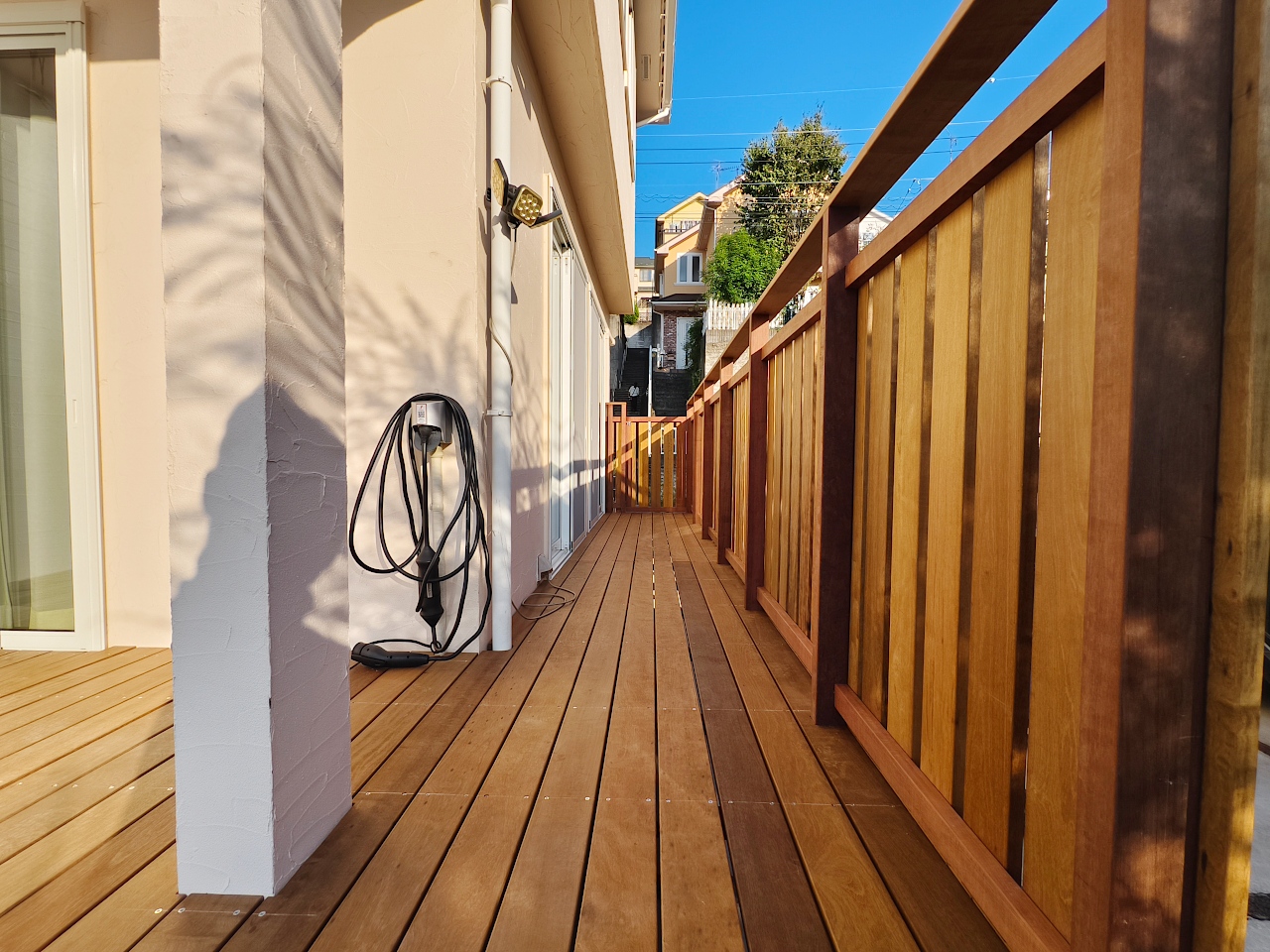 いかがでしょうか。無機質だった空間が、ハードウッドの温かみに包まれた、奥行きのあるウッドデッキへと生まれ変わりました。