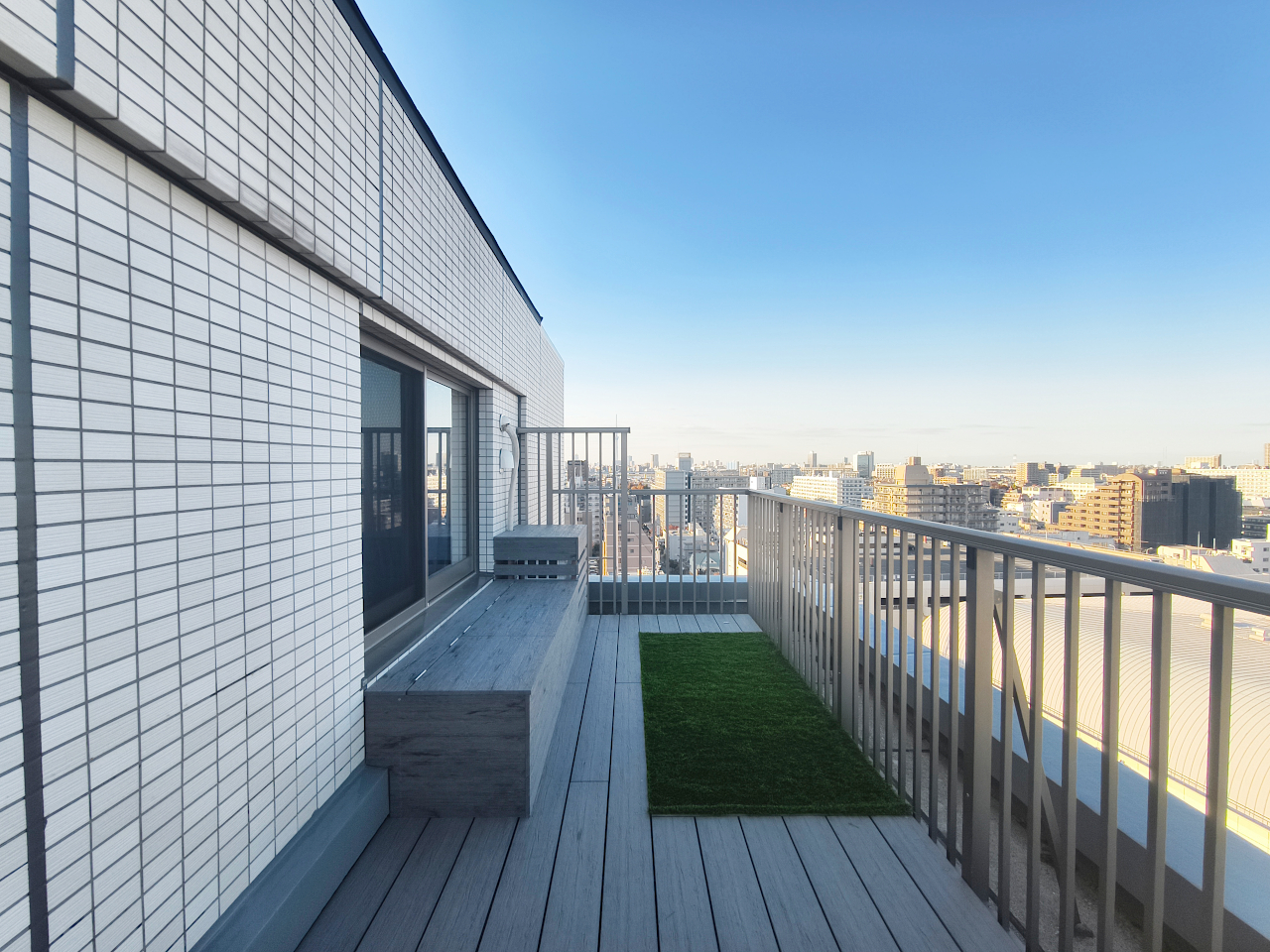いかがでしょう! 全体を落ち着いたグレーのウッドデッキで統一し、都会の景色に馴染むモダンな雰囲気に仕上げました。