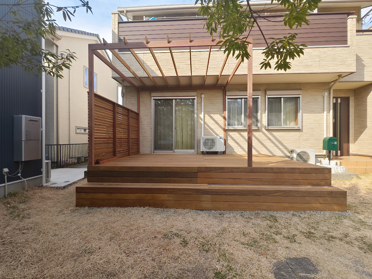 今回は、広々とした戸建てのお庭に、パーゴラ付きのウッドデッキを設置した事例をご紹介します。