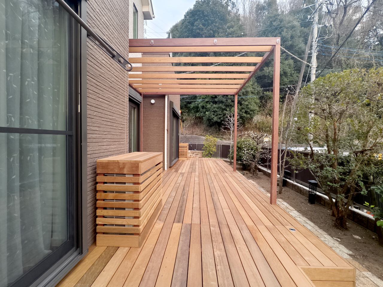 デッキ上で場所を取っていたエアコンの室外機には、ハードウッドで「造作カバー」を設置しました。 むき出しの機械や配管を隠すことで、お孫さんが触れて怪我をするリスクを減らすことができます。 天板はフラットに仕上げているので、おもちゃを置いたり、おやつの時のサイドテーブルとしても活用できます。