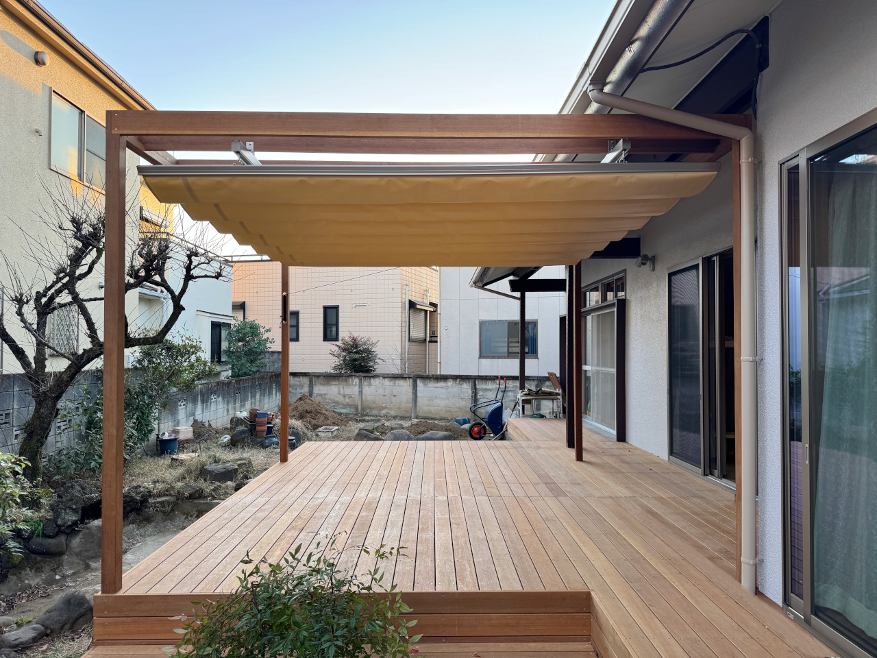ウッドデッキには、パーゴラとオーニングを組み合わせて、日差しをやわらかく調整できる設計に。