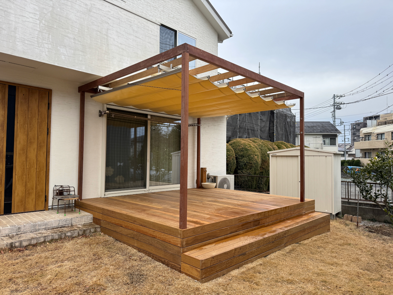 パーゴラ・オーニング付きのウッドデッキが完成。