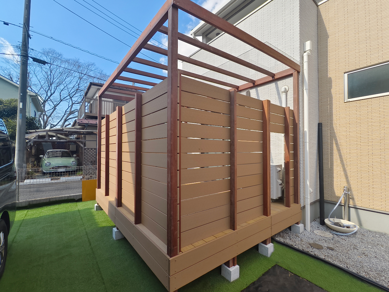 視線を気にせずリラックス。目隠しフェンスと便利なテラス屋根のあるウッドデッキ【相模原市 一戸建て庭 樹脂木デッキ 】