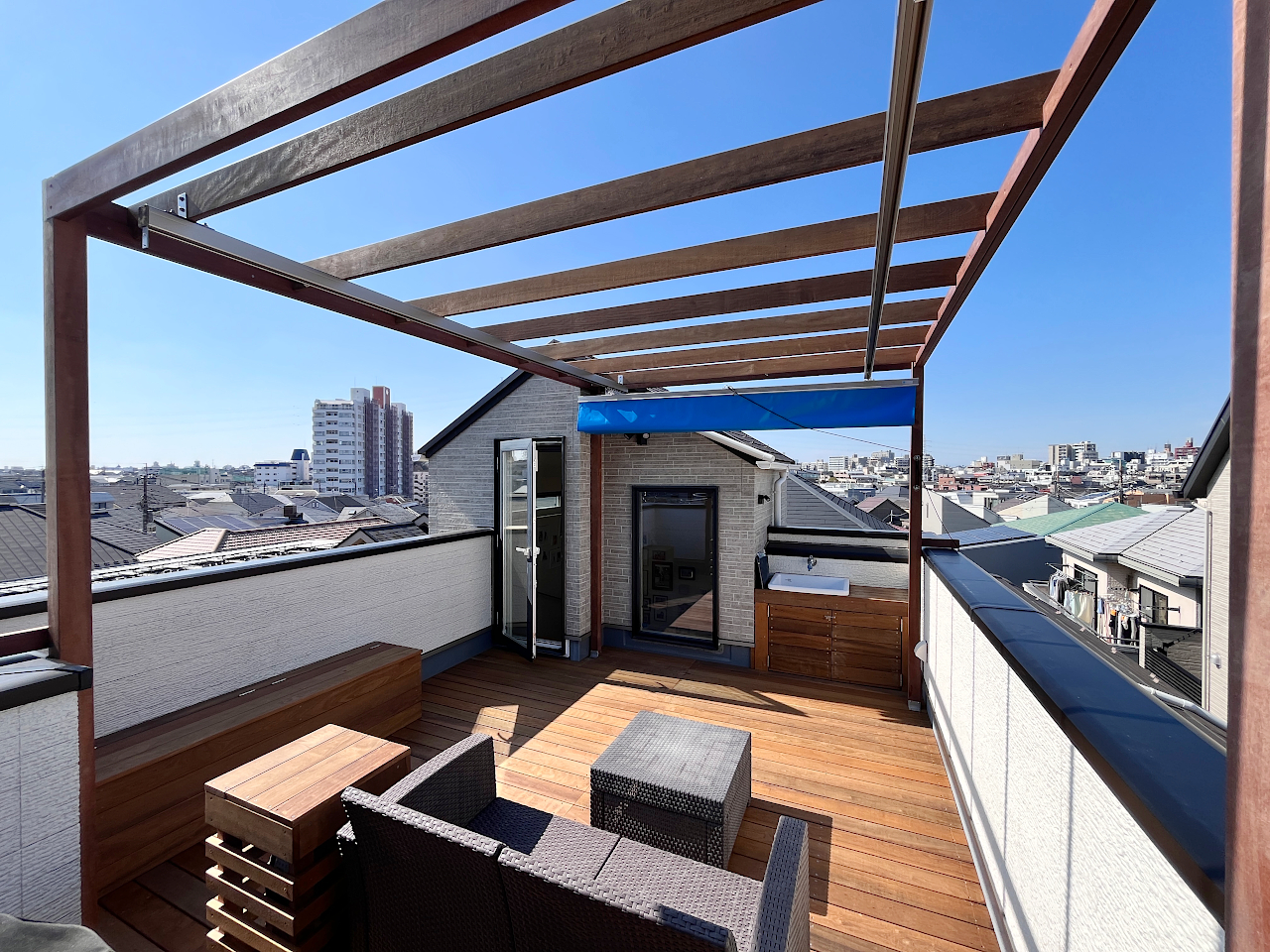屋上の日よけは単独でのご注文はいただけませんが、弊社ウッドデッキに固定する方法であればご提案が可能でしたので、フラットバルコニーデッキとご一緒にご注文いただきました。