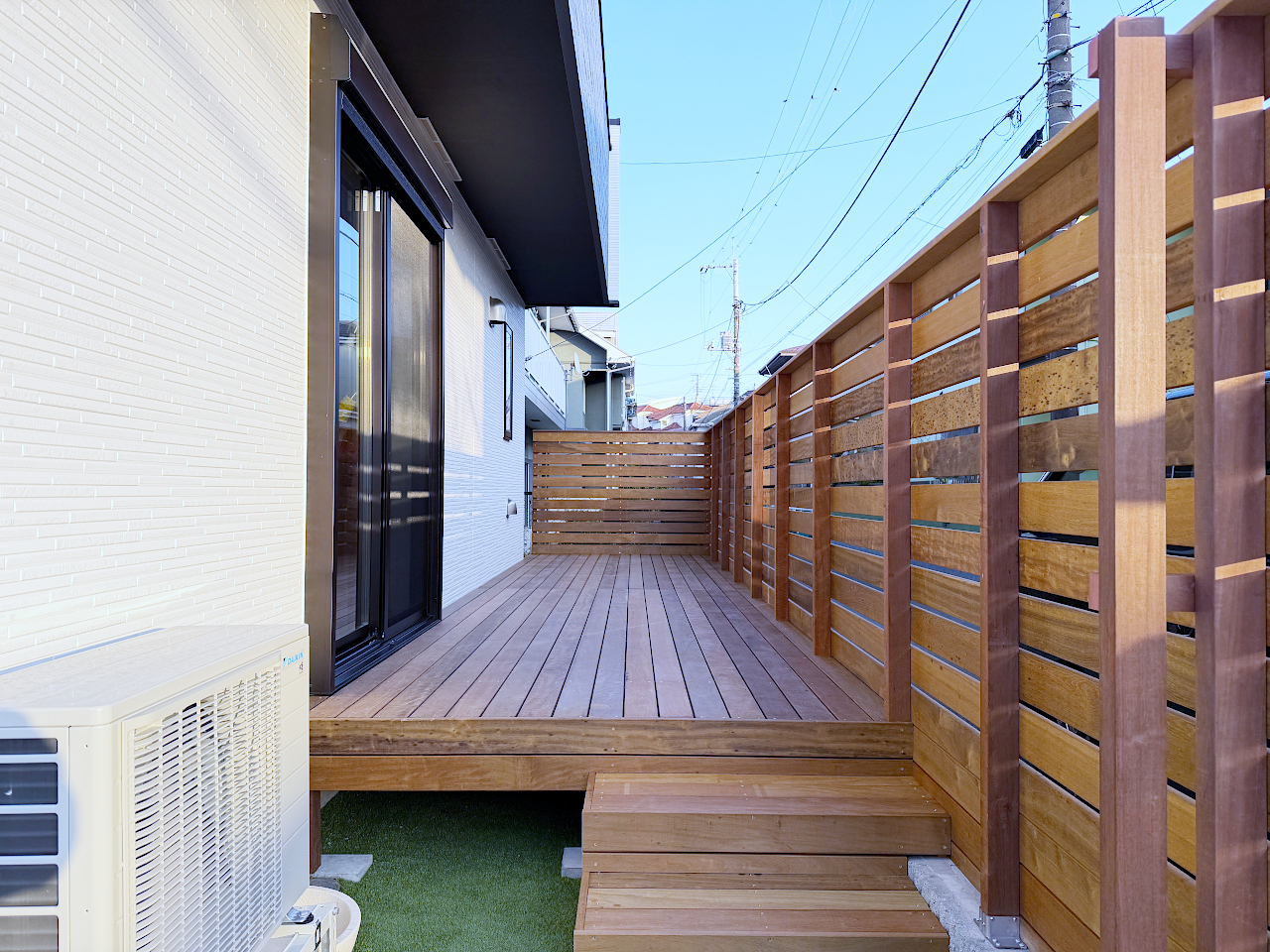 裸足で歩きたくなる天然木の優しい肌触りが感じられるウッドデッキが完成しました。