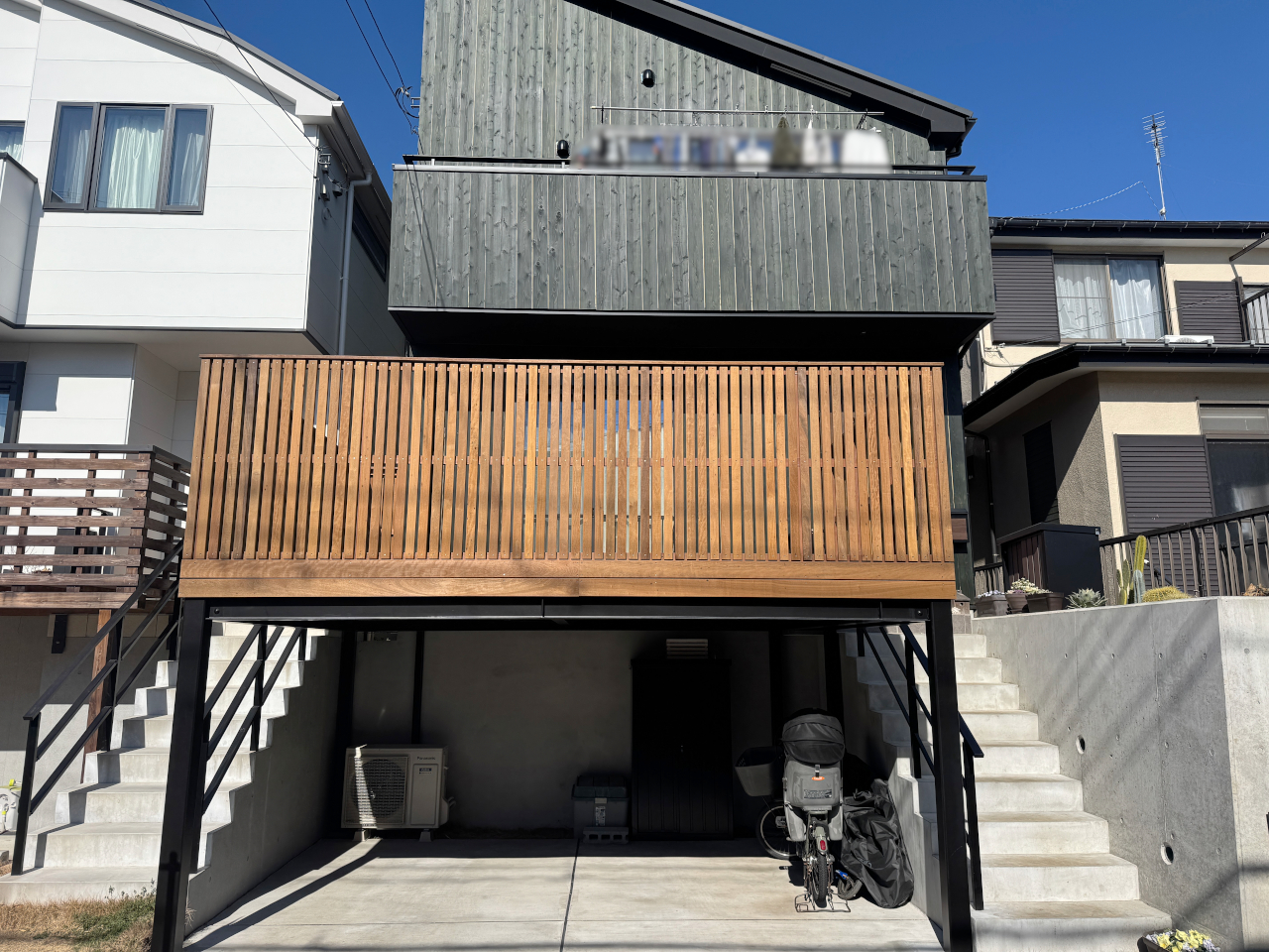 駐車場スペースの上部を活用し、鉄骨架台によるハイデッキを施工しました。