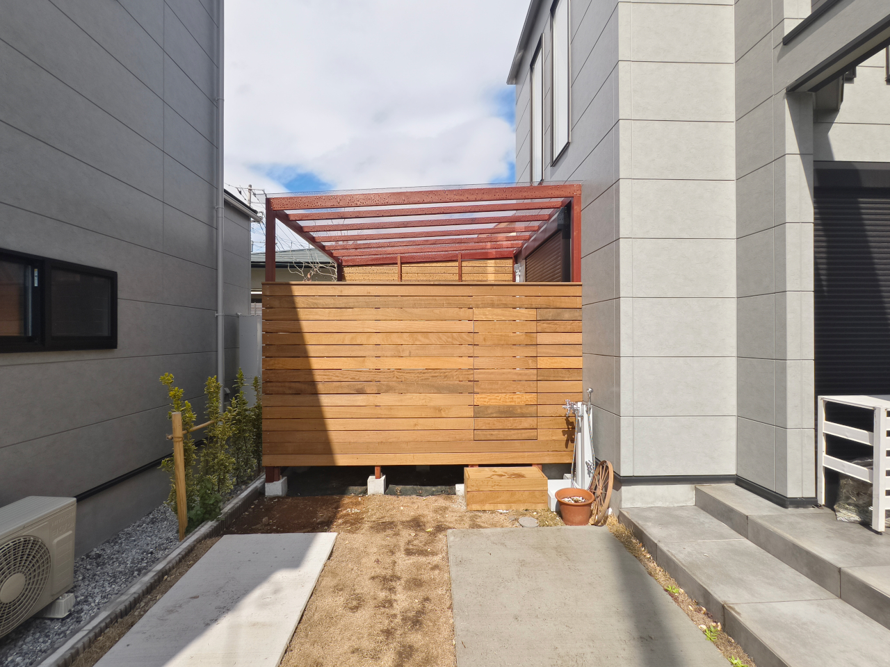 今回は、パーゴラをベースに「目隠しフェンス」と「ポリカ屋根」を組み合わせ、周囲を気にせずゆったりとくつろげる、特別なプライベート空間を造り上げました。
