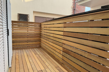 ウリンの柱と簾の目隠しができました。デッキ材を使って機能とデザインをマッチング。
